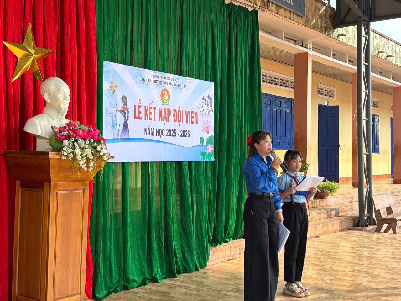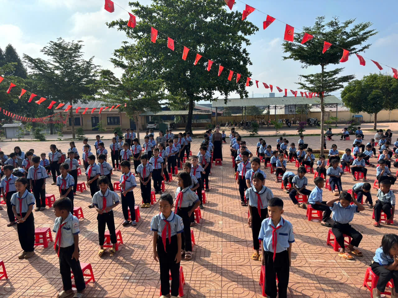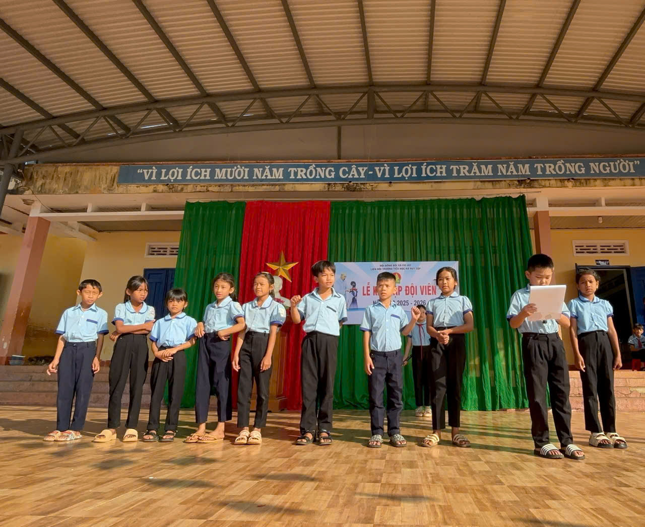 Buổi lễ diễn ra trong không khí trang nghiêm, mở đầu bằng nghi thức chào cờ thiêng liêng, thể hiện lòng tự hào dân tộc và tinh thần trách nhiệm của đội viên, nhi đồng trong toàn trường.
