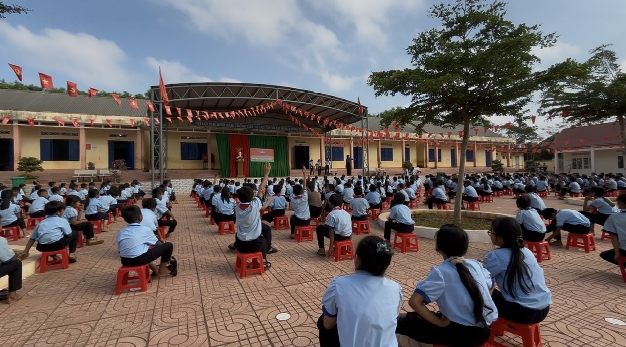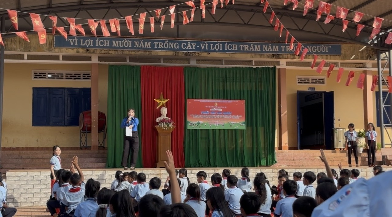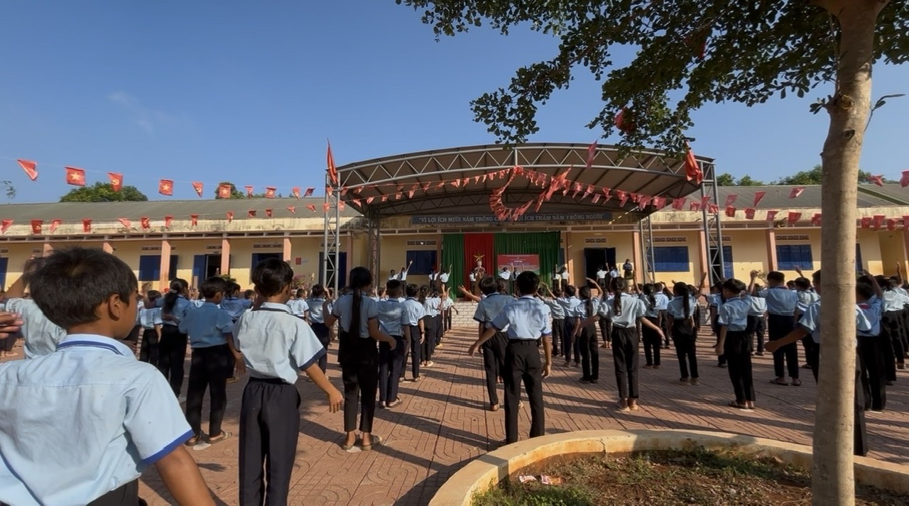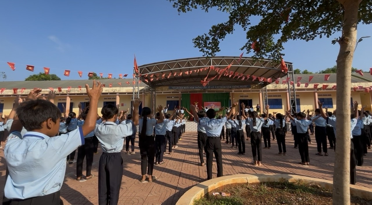 Mở đầu chương trình là nghi thức chào cờ trang nghiêm, thể hiện tinh thần yêu nước, niềm tự hào dân tộc của các em học sinh. Tiếp đó, không khí ngày hội trở nên sôi động với tiết mục nhảy đồng diễn “Cùng Kun bảo vệ muôn loài”, thu hút sự tham gia nhiệt tình của đông đảo học sinh toàn trường. Qua đó, góp phần giáo dục ý thức bảo vệ môi trường, yêu thiên nhiên và lan tỏa thông điệp sống xanh, tích cực đến các em.